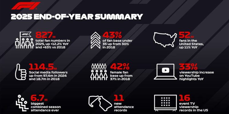 Globální fanouškovská základna formule 1 dosáhla v roce 2025 počtu 827 milionů, což představuje meziroční nárůst o 12 % a nárůst o 63 % oproti roku 2018.